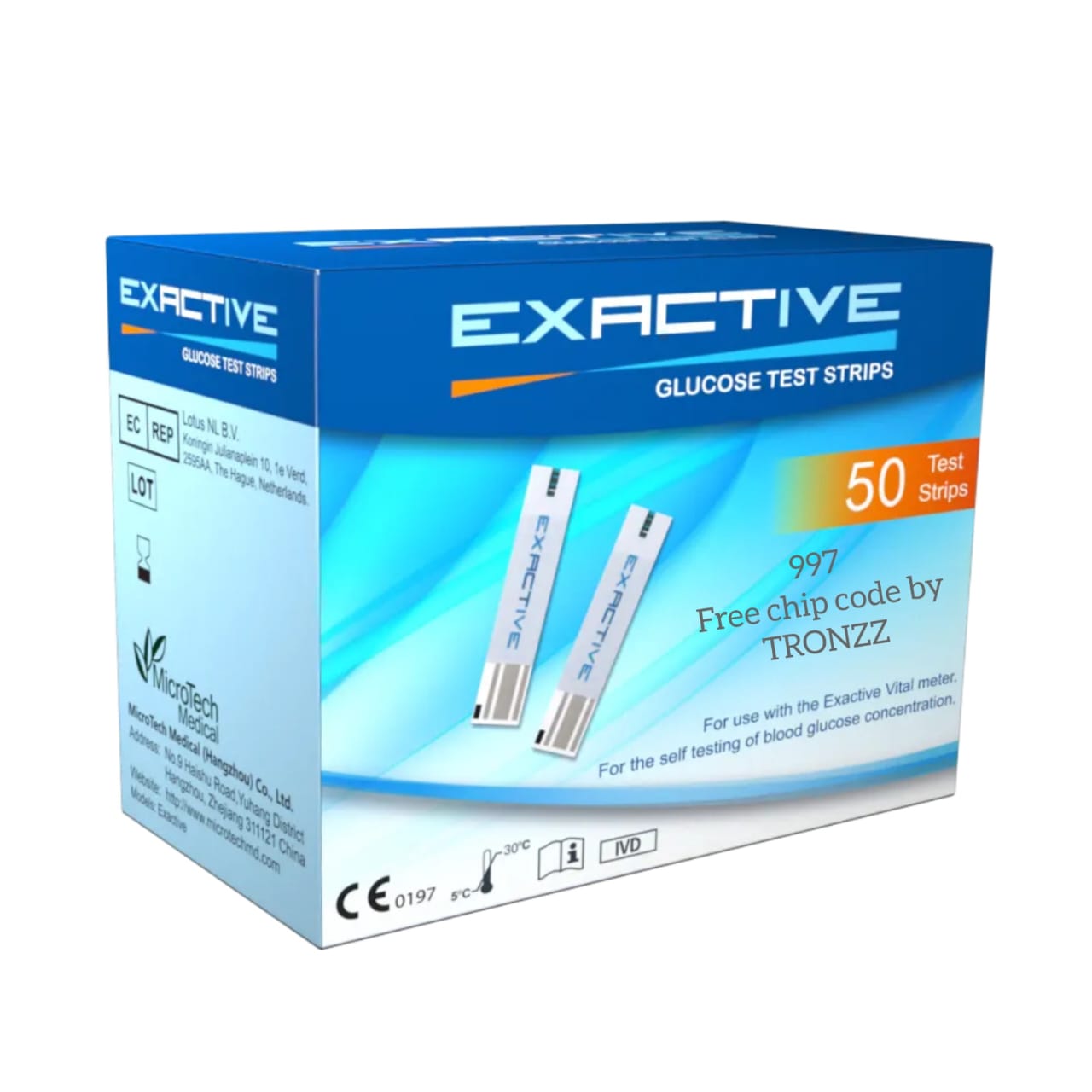 Exactive Vital Blood Glucose Test Strips (2 vials × 25, box of 50) are USA-certified and include 1 free 997 chip code. Featuring advanced auto-calibration technology, these strips ensure fast and accurate results. Buy now exclusively at TRONZZ for guaranteed authenticity and a long shelf life.