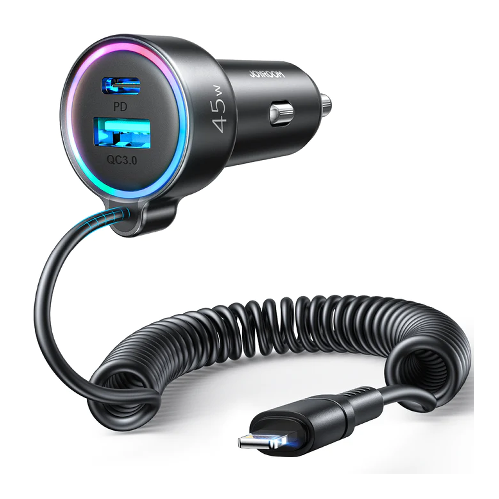 Features: USB-C wired car charger, 45W large power output, capable of charging for 3 devices simultaneously. Supported fast charge protocols include PD3.0, QC3.0, PPS, Samsung AFC, HUAWEI FCP. Extendable coiled cable design, Max length up to 1.5m, convenient for use without winding Colorful LED light, easy to find the charging ports at night Intelligent recognition chip, proper power current distribution, friendly for phones and cars. Flame-retardant PC material, charging without heating, safety assured Passed CE, FCC, RoHS certifications.