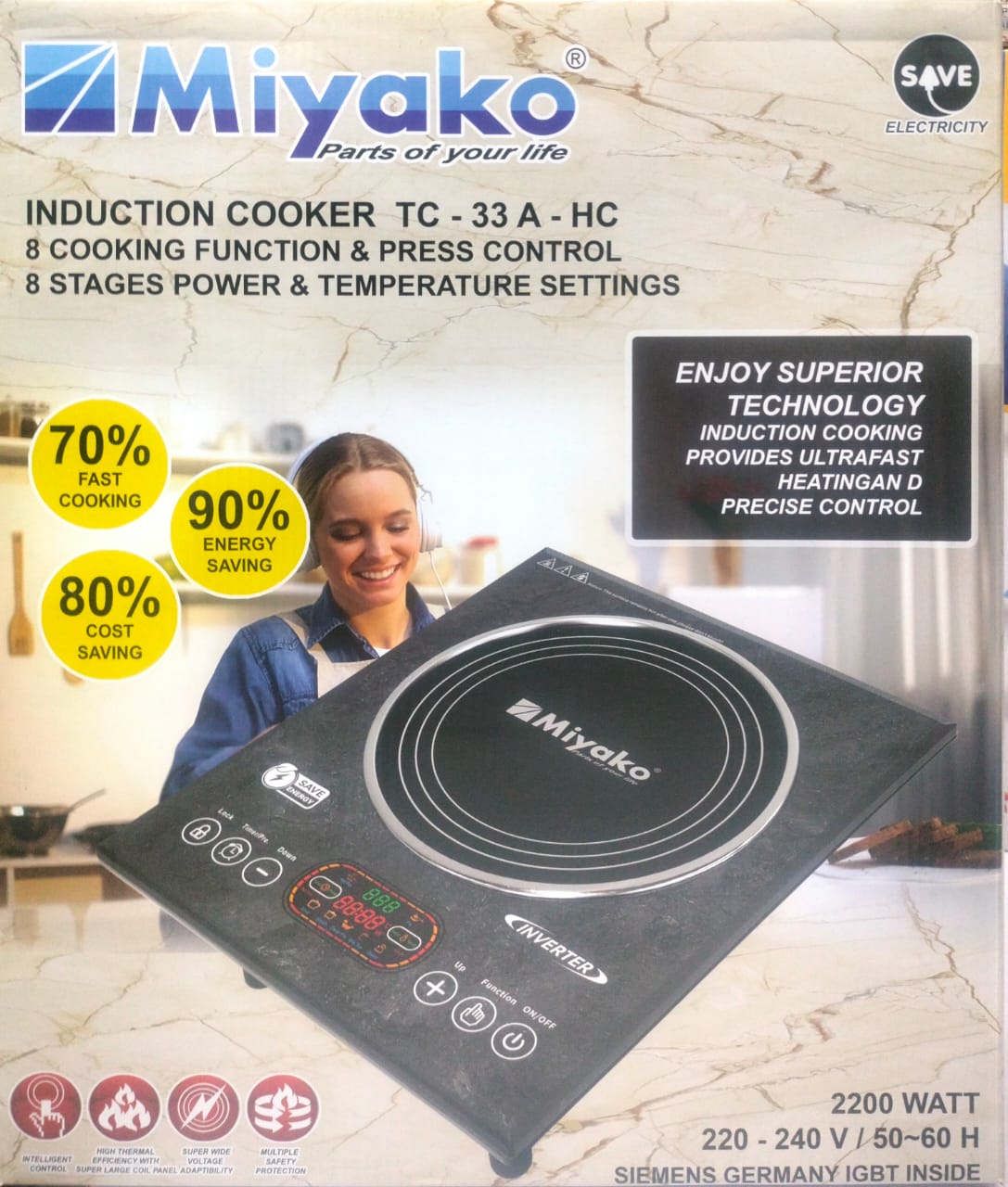 The Miyako 2200W Induction Cooker (TC-MARBLE) is a high-powered, energy-efficient cooking appliance designed for fast and precise cooking. Featuring a sleek marble-patterned design, it offers 2200 watts of cooking power and multiple heat settings for various cooking needs. It provides easy-to-use touch controls, a digital display, and automatic safety features such as overheat protection. Ideal for quick meals, it is compatible with induction-ready cookware and ensures even heating for efficient cooking.