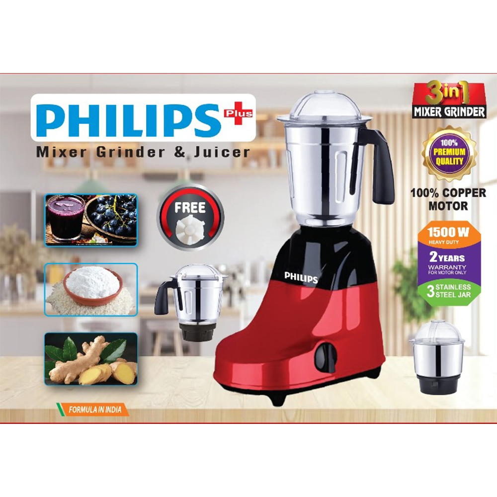 Upgrade your kitchen with the Philips 3-in-1 Mixer, Grinder & Juicer. Powered by a 1500W 100% copper motor, it ensures powerful performance for blending, grinding, and juicing. Comes with 3 stainless steel jars for versatile use – perfect for smoothies, spices, pastes, and fresh juice. Built with premium quality, heavy-duty design, and easy-to-clean jars, this is the ultimate kitchen solution.